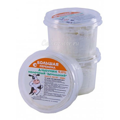 Творог альбуминовый – побочный продукт сырного производства, изготовляется из сырной сыворотки, поэтому не содержит жиров, что делает альбуминовый творог ценным диетическим продуктом. По внешнему виду и вкусовым качествам творог альбуминовый практически ничем не отличается от обычного творога, это рассыпчатая масса белого или чуть желтоватого цвета, с характерным кисломолочным запахом и творожным вкусом (calorizator). Продукт имеет короткий срок хранения – не более 4-х суток в холодильнике, открытую пачку следует употребить в течение 36-ти часов.